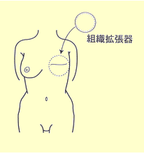 胸の筋肉(大胸筋)の下に、組織拡張器という胸の皮膚・筋肉を伸ばす装置をいれる手術を行います。約6ヶ月の間、生理食塩水を3~4週間に1回の割合で、組織拡張器へ注入(外来で行う)して徐々に組織拡張器を膨らましてゆくと胸の皮膚も膨らんできます。約6ヶ月後に十分に皮膚・筋肉が伸びたところで人工乳房を入れて乳房を作る方法です。