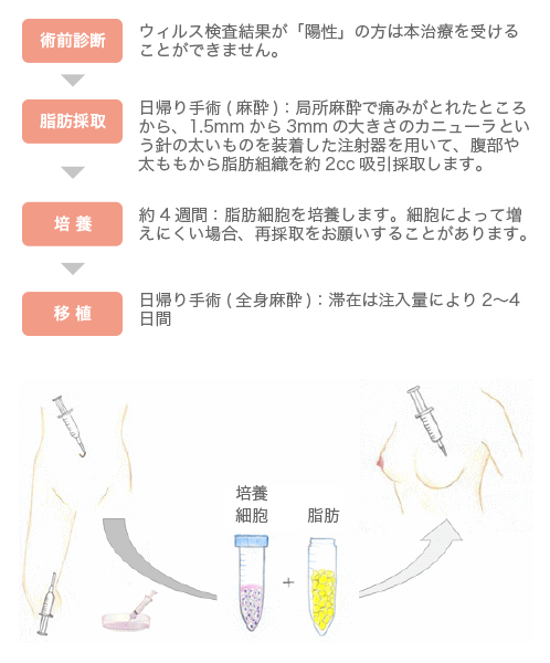 移植するために脂肪を採取する必要があります。脂肪採取は外来で、日帰りで行います。脂肪の採取は局所麻酔下で行います。通常、腹部又は大腿部から少量の脂肪を注射器で吸引採取します。採取のために約 2~3 mm くらいの傷はできますが、これが、外観上目立つことはないと考えます。脂肪採取と同じ日に培養に必要なご自身の血液を採取します。脂肪採取部の傷の処置はご自身で行っていただいています。数日で傷はふさがります。